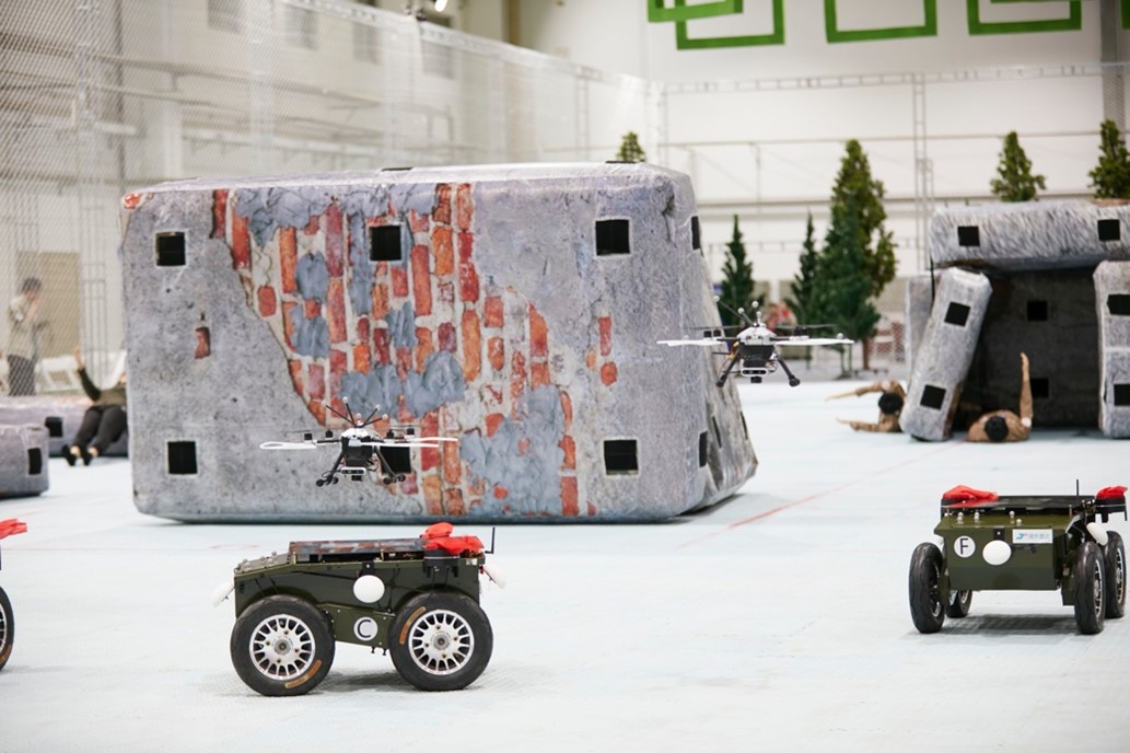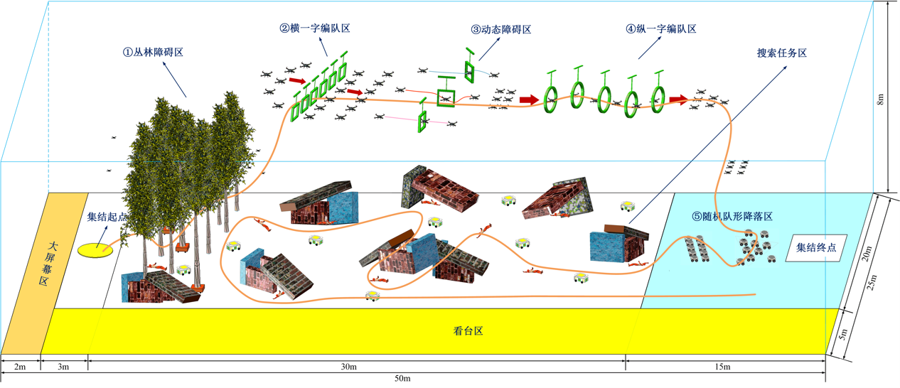 本次比赛任务要求无人蜂群在地震灾后救援中执行避障快速集结、协同自主搜索两项任务,每项任务内容包括3个单项子任务,分别为丛林障碍穿越与横一字编队、动态障碍穿越和纵一字编队、随机队形编队和跟踪降落,以及自主搜索、辅助信息利用、威胁消除等,全程要求无人蜂群自主协同完成,参赛队不进行操作干预。