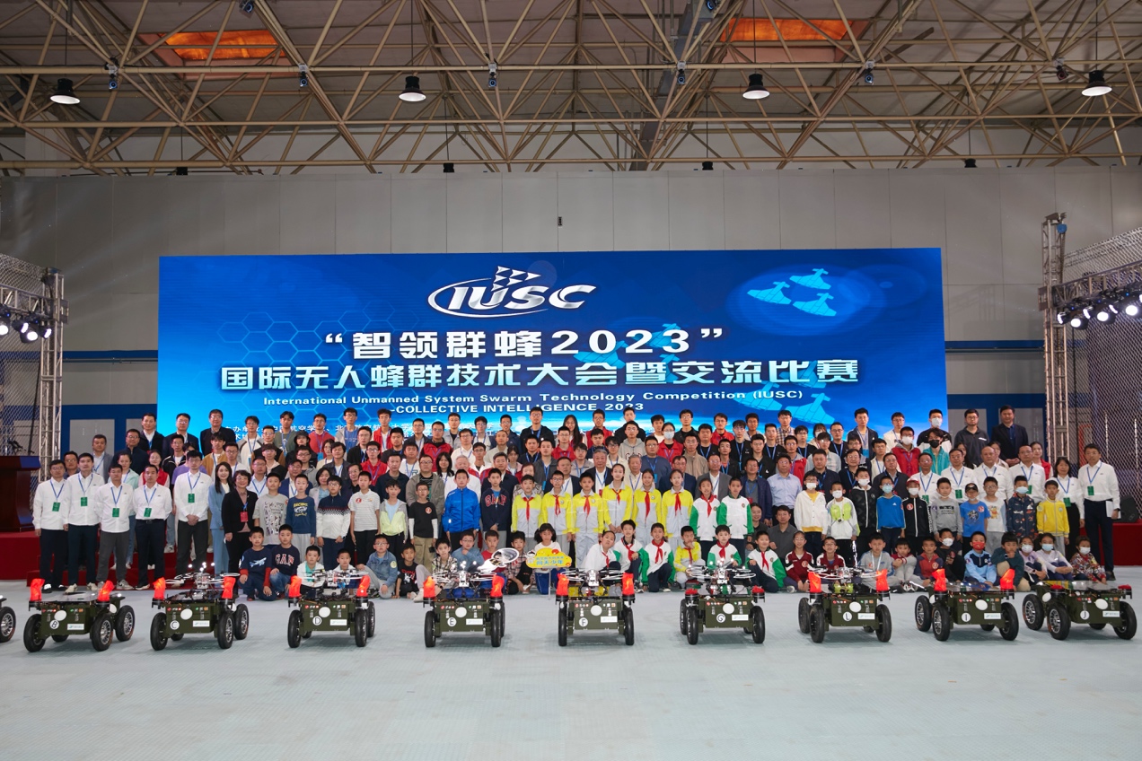 2023年5月7日,“智领群蜂2023”国际无人蜂群技术大会在北航开幕。组委会主任、中国航空学会理事长林左鸣宣布大会开幕,组委会主任、北航副校长陶智,顾问刘大响院士、孙聪院士、苏东林院士,主办方和各支持单位负责人出席开幕式。现场特别邀请了来自《问天少年》读者群以及北京市朝阳区垂杨柳中心小学馨园分校的50多名热爱科学的中小学生,组成问天少年队观礼观赛。