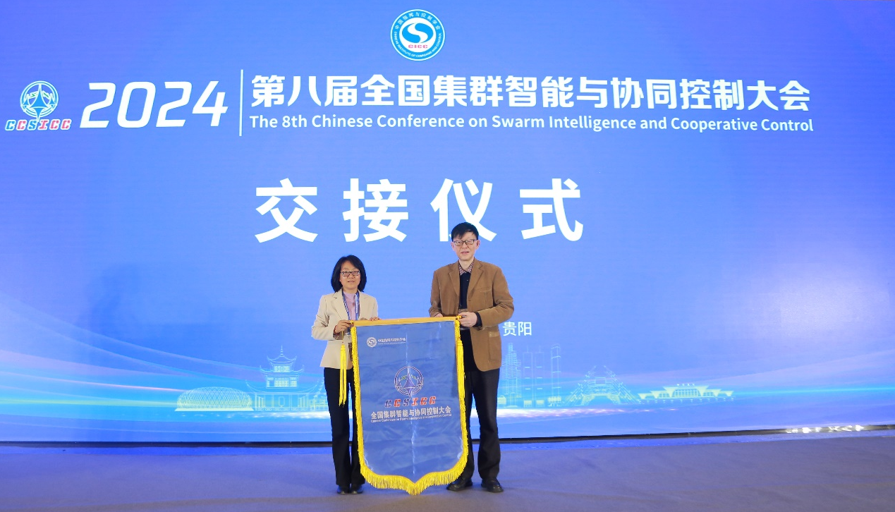 在大会闭幕式环节举行了全国集群智能与协同控制大会的会旗交接仪式。2025第九届全国集群智能与协同控制大会将由上海交通大学牵头联合我校威廉希尔足球官网、人工智能学院、自动化科学与电气工程学院等单位在上海承办。来自上海交通大学的关新平院长代表承办单位从本届大会的主承办方中国航天科工集团十院十部刘莉副主任的手中接过大会的会旗,标志着本届大会圆满结束,同时新一届大会的筹备工作正式启动。关新平院长进一步介绍了新一届大会的筹备方案、发布了征文通知,并向与会代表发出了参加2025第九届全国集群智能与协同控制大会的官方邀请。