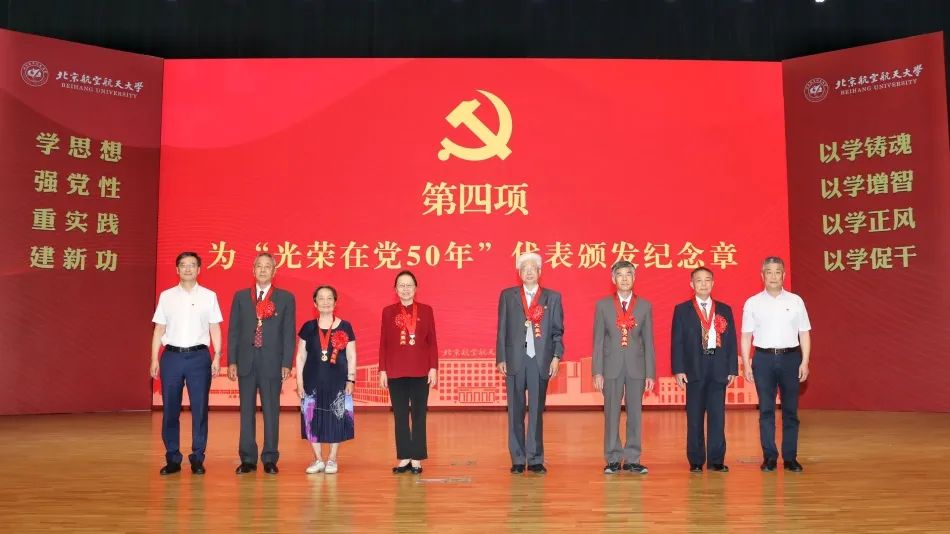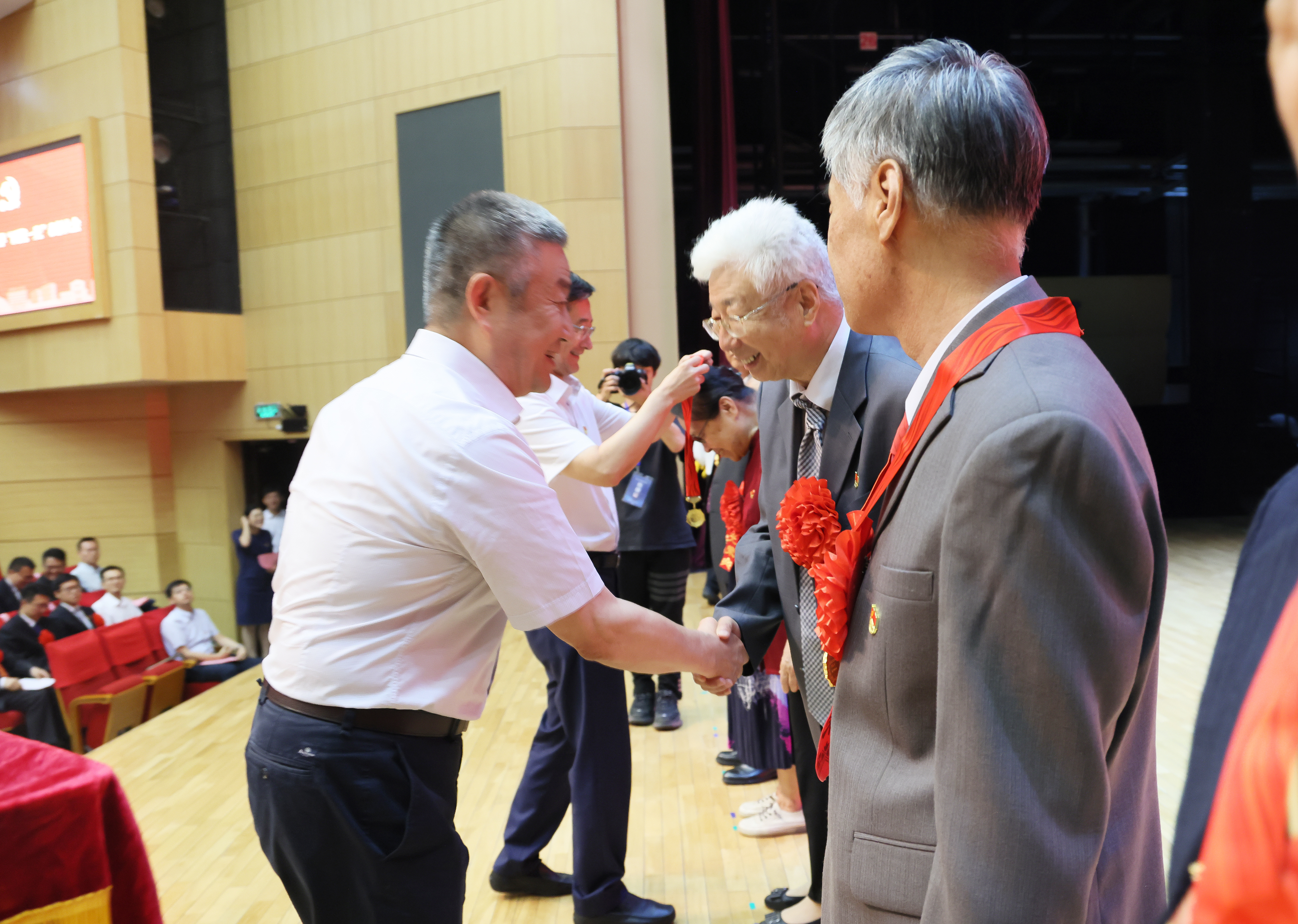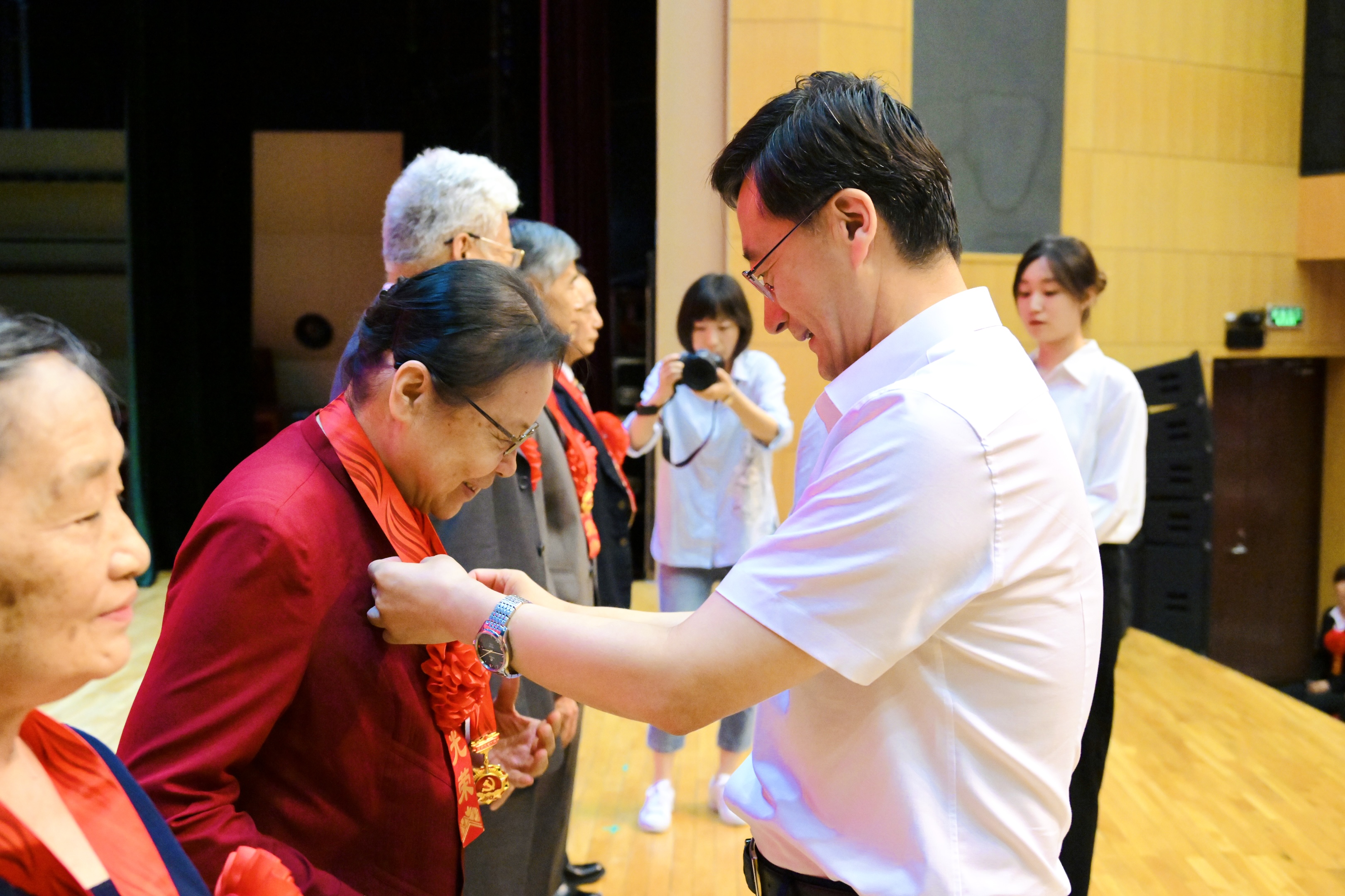 校党委书记赵长禄,党委副书记、校长王云鹏为“光荣在党50年”老党员代表颁发纪念章